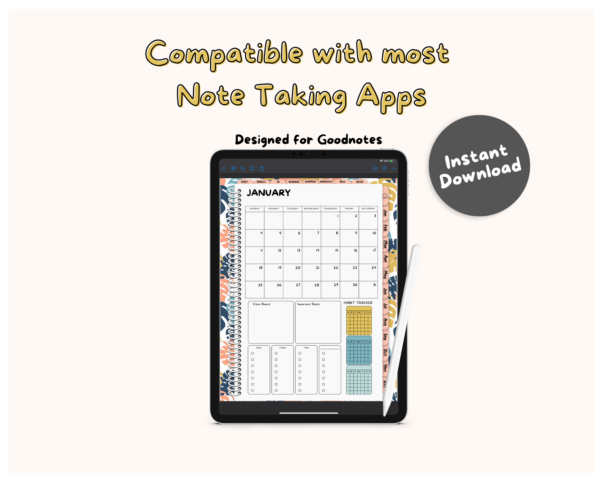 This Digital Planner is an instant download. No physical product will be mailed to you. You will need a note taking app in order to use this product. While our planners are compatible with most note taking apps, this planner was developed with Goodnotes features in mind.